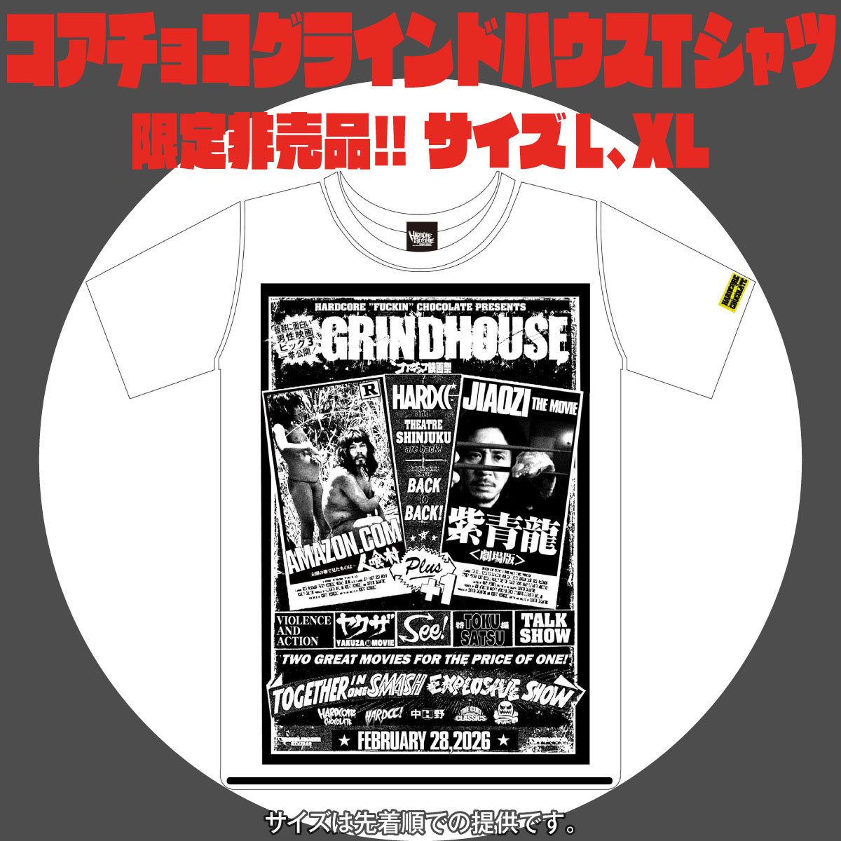 ※限定コアチョコグラインドハウスTシャツは、映画祭当日にLサイズ、XLサイズを先着順でお渡しいたします。